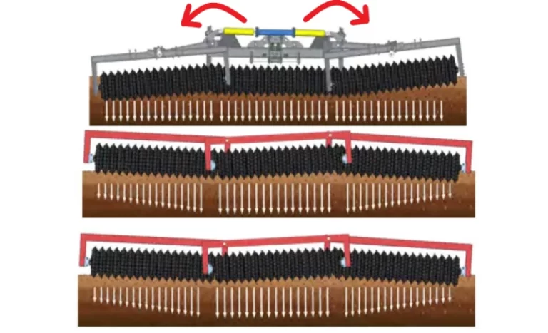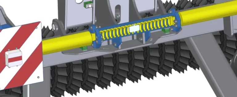 In der Arbeitsposition werden diese Federn verwendet, um das Gewicht vom schwereren Element in der Mitte – bedingt durch die Radstruktur und die Zugvorrichtung – auf die äußeren Walzenelemente zu übertragen, um eine völlig gleichmäßige Gewichtsverteilung zu erreichen.